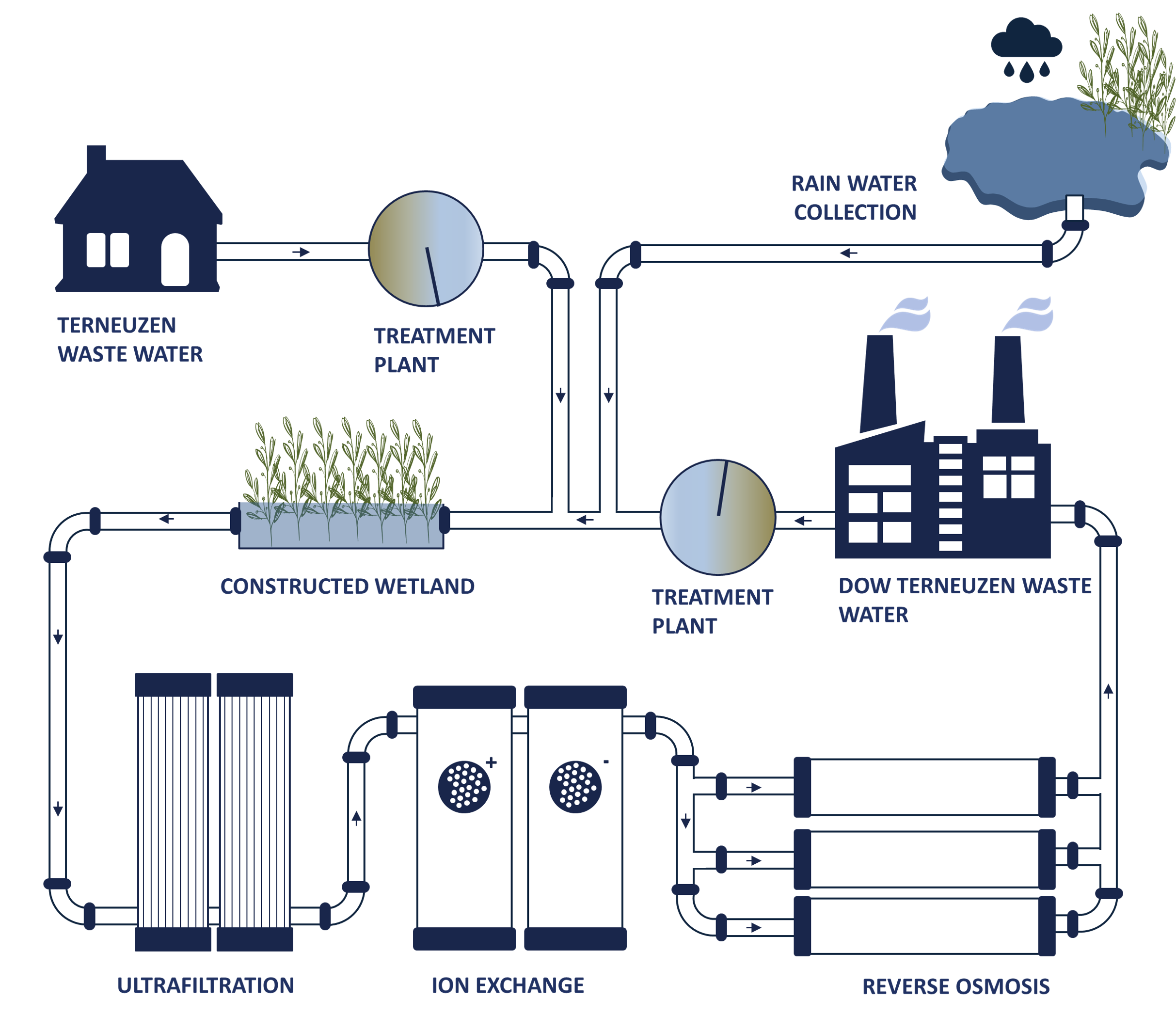 Een twee jaar durend proefproject dat onderzoek voert naar hergebruik van afvalwater van de chemische fabriek en RWZI-effluent van de stad Terneuzen. De beoogde toekomstige fabriek is in het klein nagebouwd. In deze mini-fabriek wordt het water behandeld door een opeenvolging van nieuwe en bestaande technieken. Als eerste wordt het water door een hybride wetland gestuurd om de organische belasting op de aansluitende membraanprocessen te verlagen. Daarna gaat het water door een ultrafiltratie (UF) installatie om de grotere deeltjes uit het water te verwijderen. Als laatste wordt het water ontzout met behulp van ionenwisseling (IX) en omgekeerde osmose (RO). De zoute afvalstroom van de omgekeerde osmose stap, het concentraat, wordt vervolgens hergebruikt bij het terugspoelen van de UF en het regenereren van de IX.