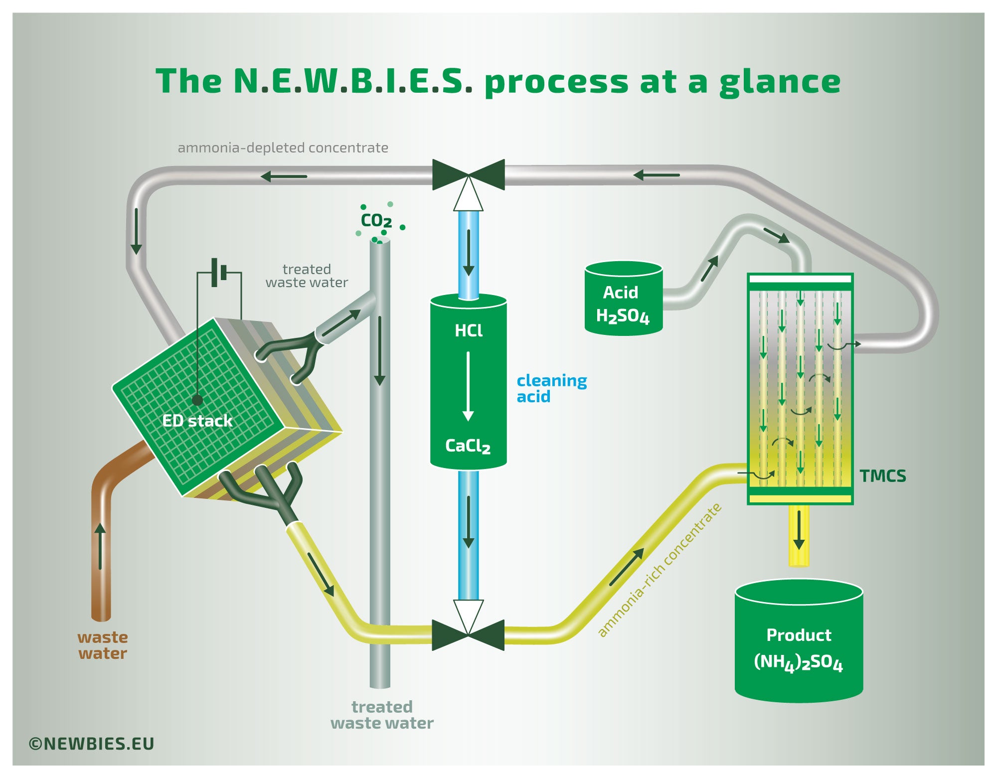 Het N.E.W.B.I.E.S-proces behandelt afvalwater met relatief hoge concentraties organische stikstof in de vorm van ammoniak (NH3). Er zijn al twee stromen getest, namelijk digestaat (vergiste biomassa) en urine. Evides Industriewater gaat percolaatwater (water uit stortplaats) behandelen. Het afvalwater wordt een elektrodialyse (ED) stack (stapel membranen) in geleid. Hierin wordt het ammonium via ionenuitwisselingsmembranen met behulp van elektriciteit naar een concentraatstroom getransporteerd. Het concentraat wordt vervolgens ingebracht in een gasmembraanstripper, waar de gasvormige ammoniak door het membraan diffundeert. Zo wordt de ammoniak overgebracht naar een productvloeistof, zoals bijvoorbeeld ammoniumsulfaat.