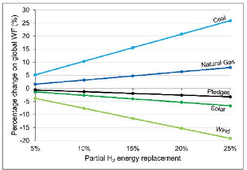 Op mondiaal niveau kan worden gesteld dat voor elke 5% van de energiebenutting uit waterstof, de energiesector een waterbesparing tussen 1 en 4 % zou kunnen hebben voor groene waterstof. Voor blauwe waterstofproductie met methaanomvorming en CO2-opslag wordt een toename van het waterverbruik tussen 1 en 5% verwacht.
