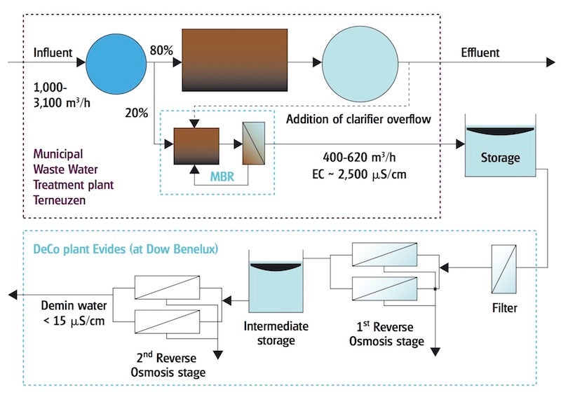 Bij de gemeentelijke rioolwaterzuivering in Terneuzen wordt bijvoorbeeld effluent door Evides geschikt gemaakt voor levering aan de industrie. Het effluent wordt door middel van een membraan-bioreactor (MBR) en omgekeerde osmose membranen (RO) opgewerkt tot demiwaterkwaliteit, conform volgend processchema.